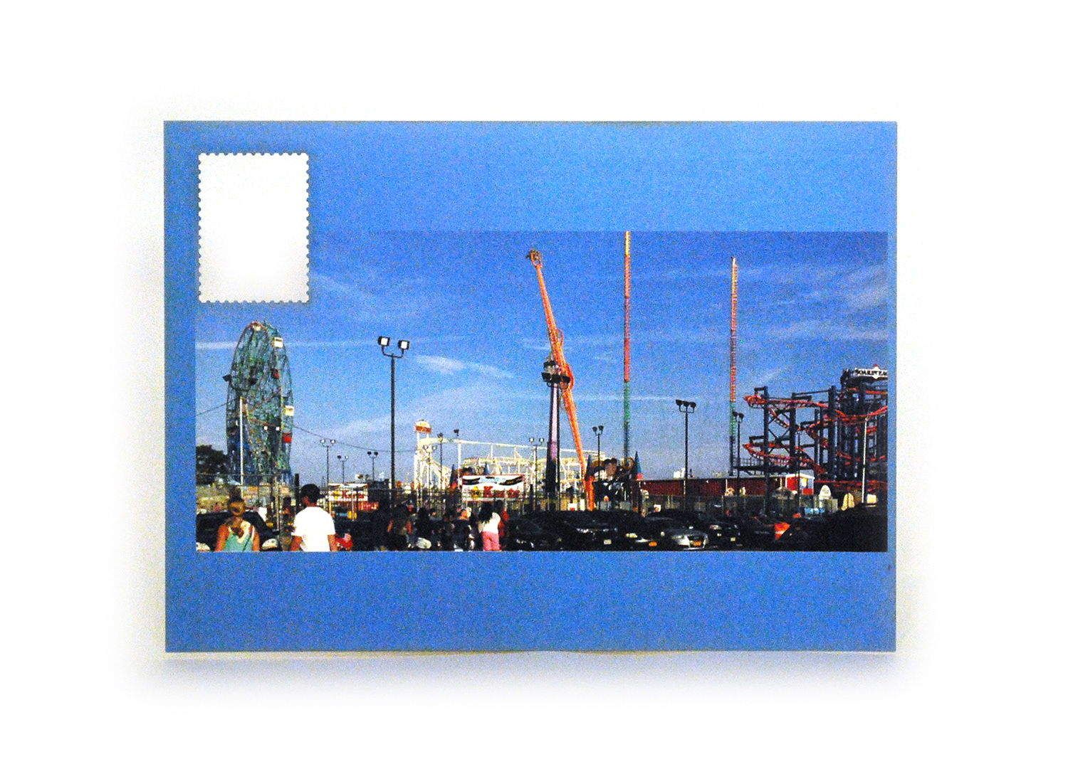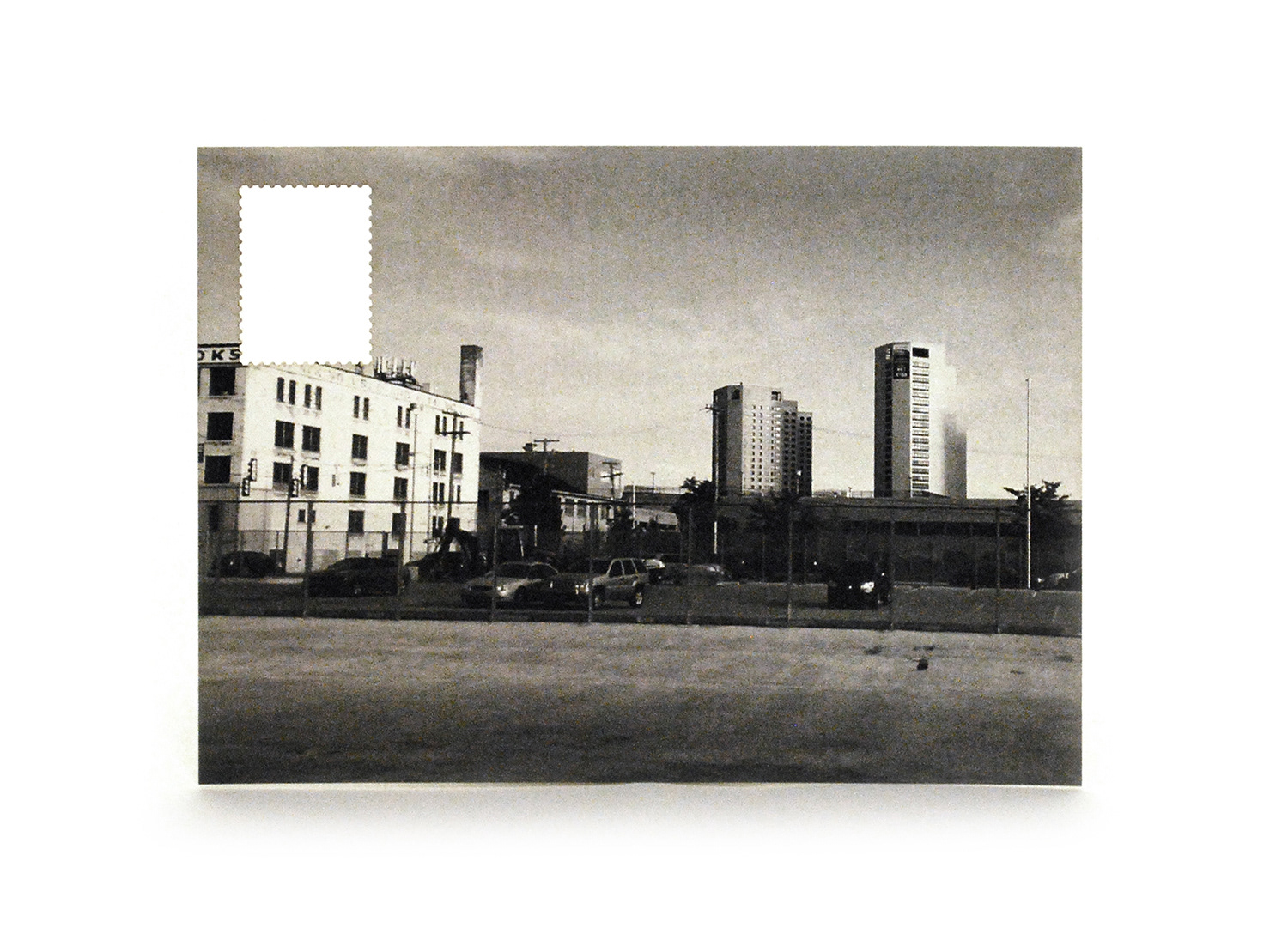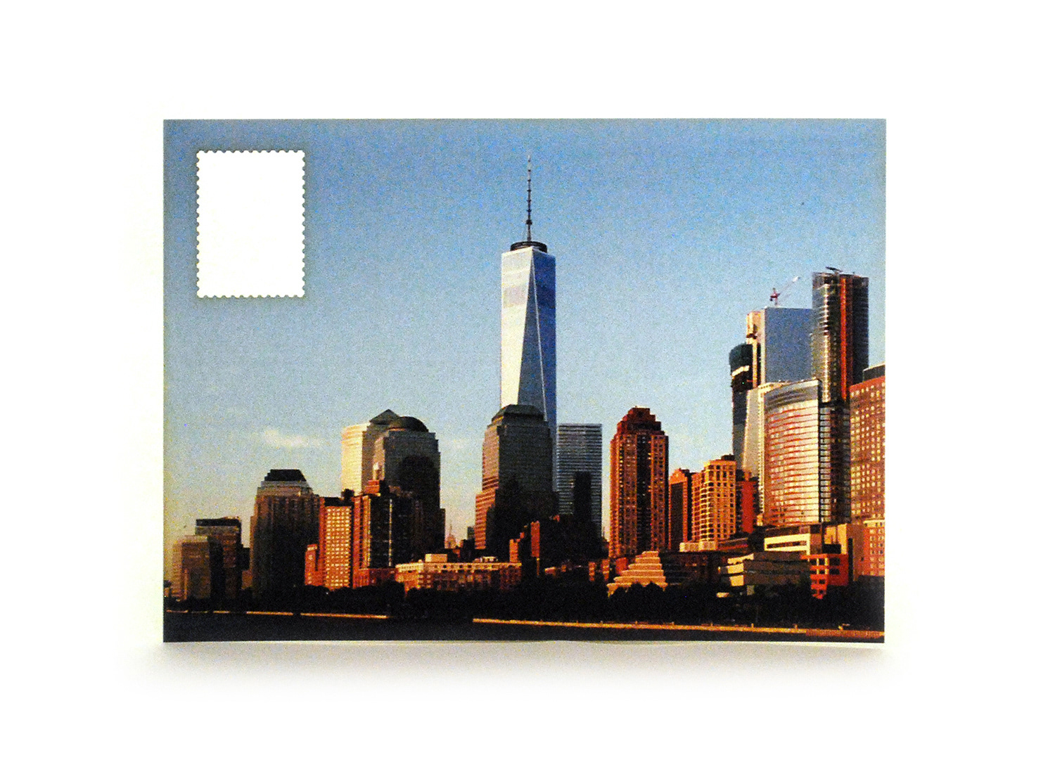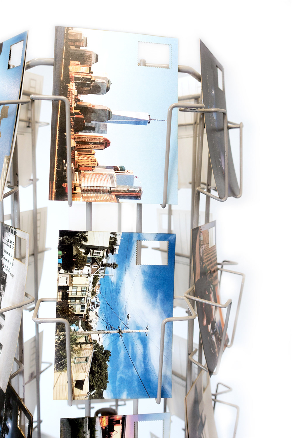 Sixteen postcards punched with a stamp shaped window. They are printed with pictures taken during my trip to the US.