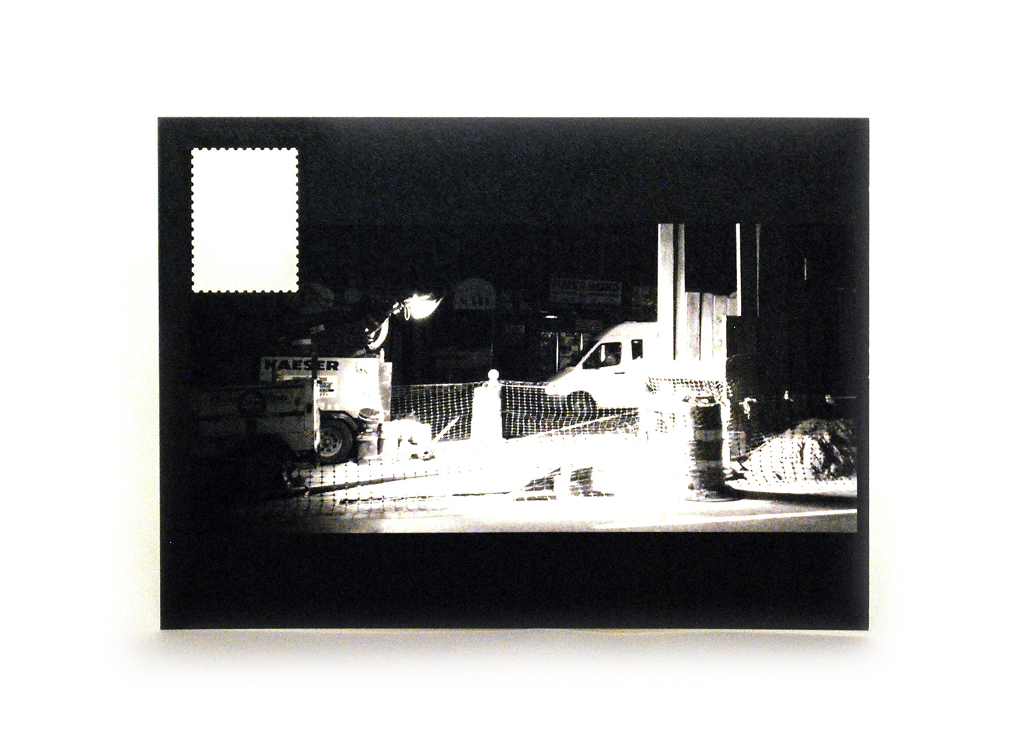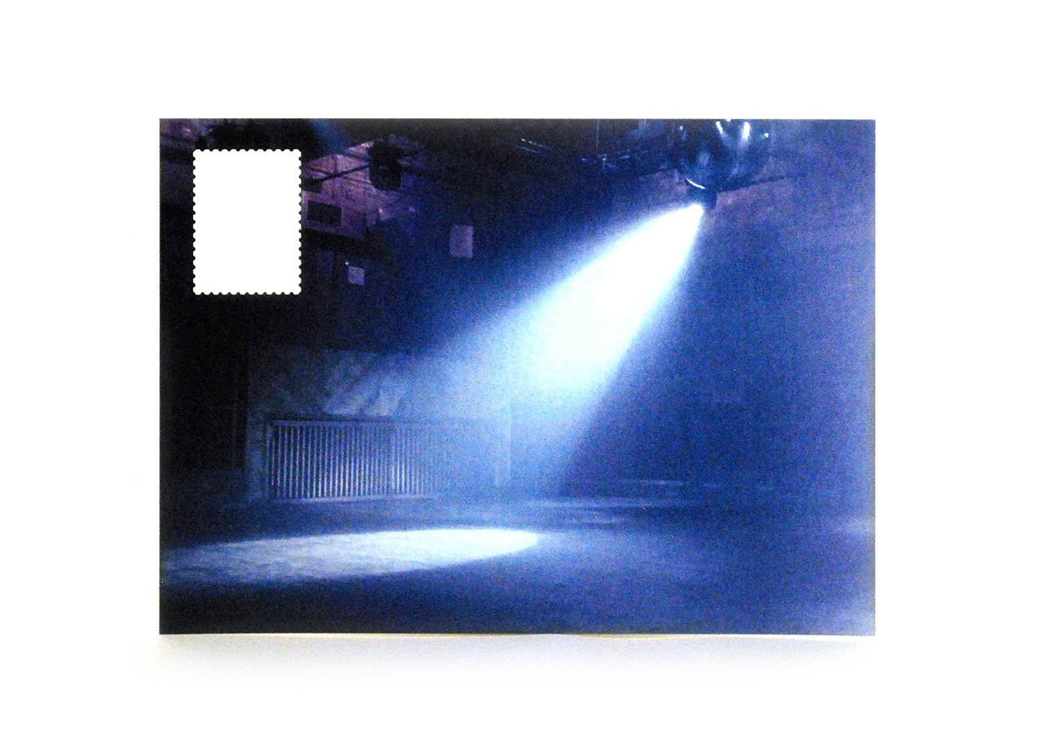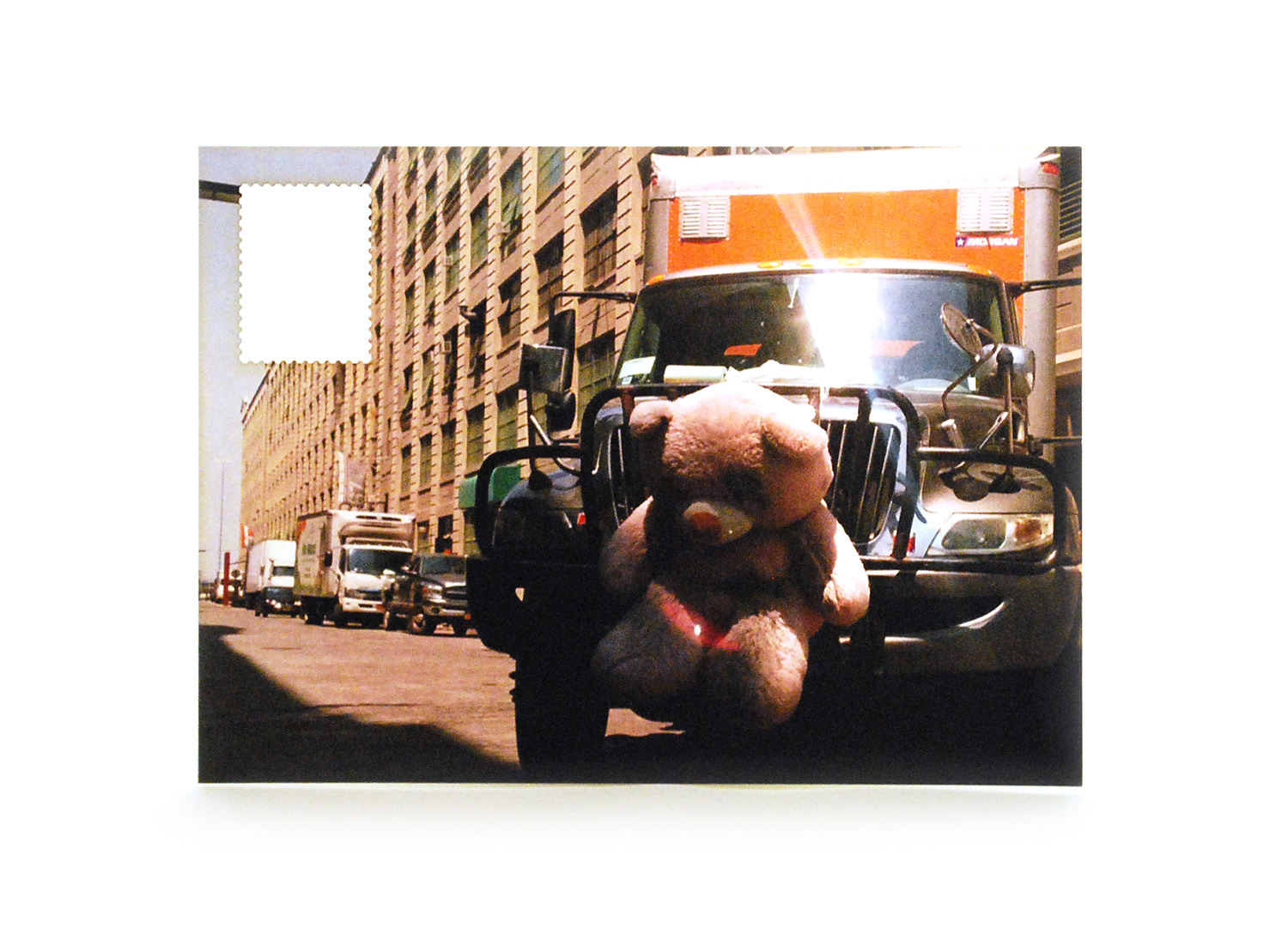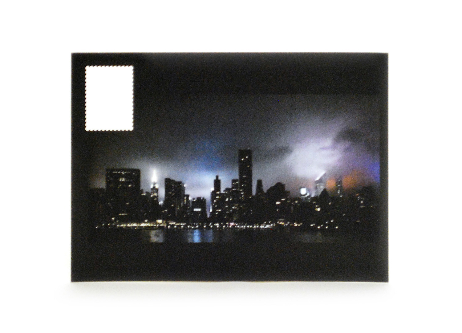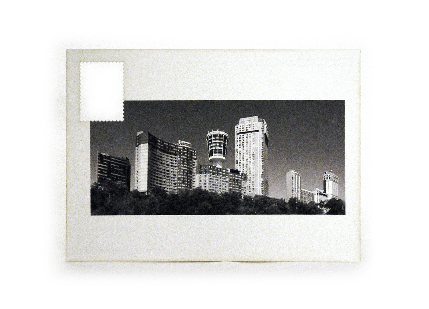 Sixteen postcards punched with a stamp shaped window. They are printed with pictures taken during my trip to the US.