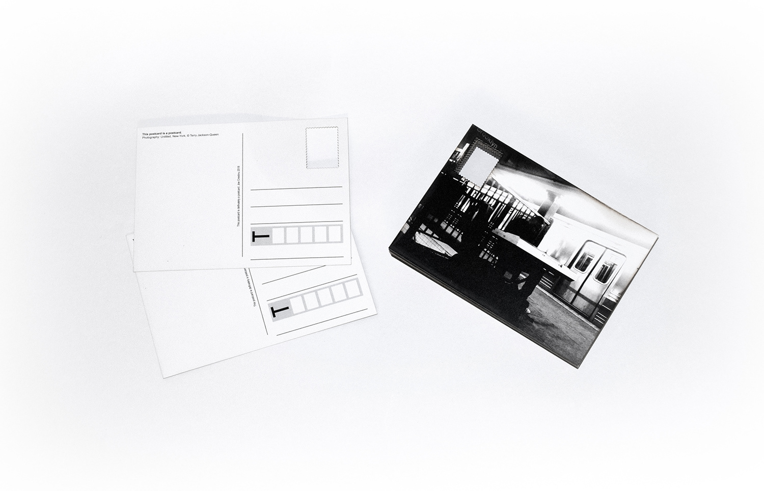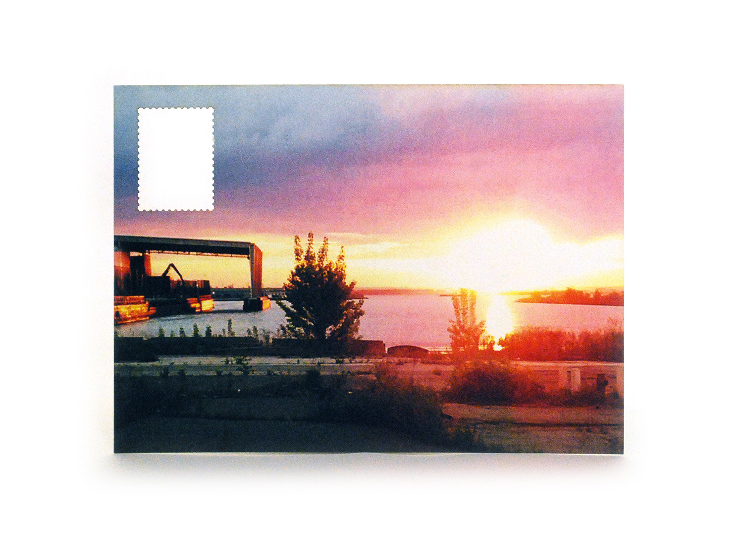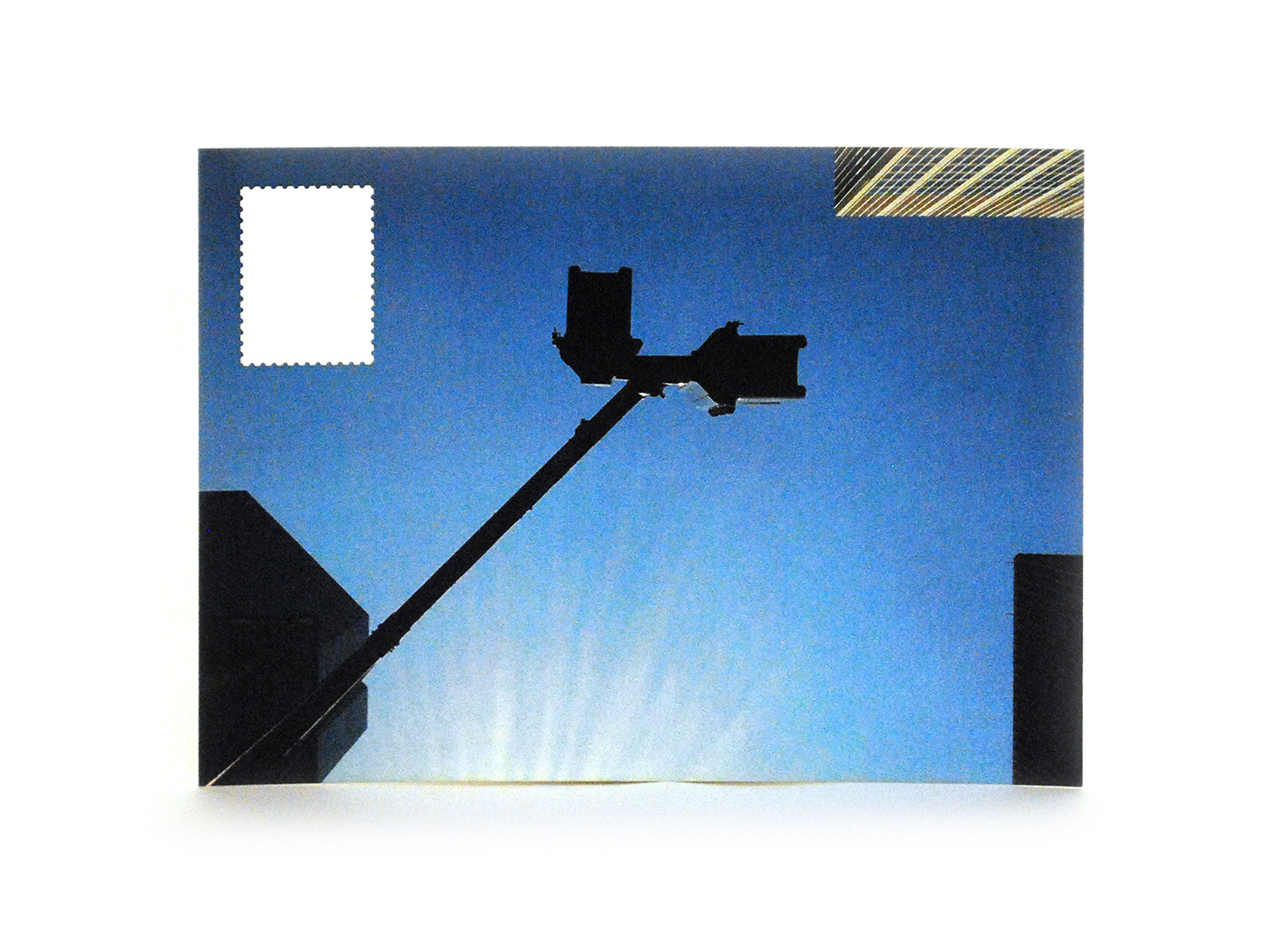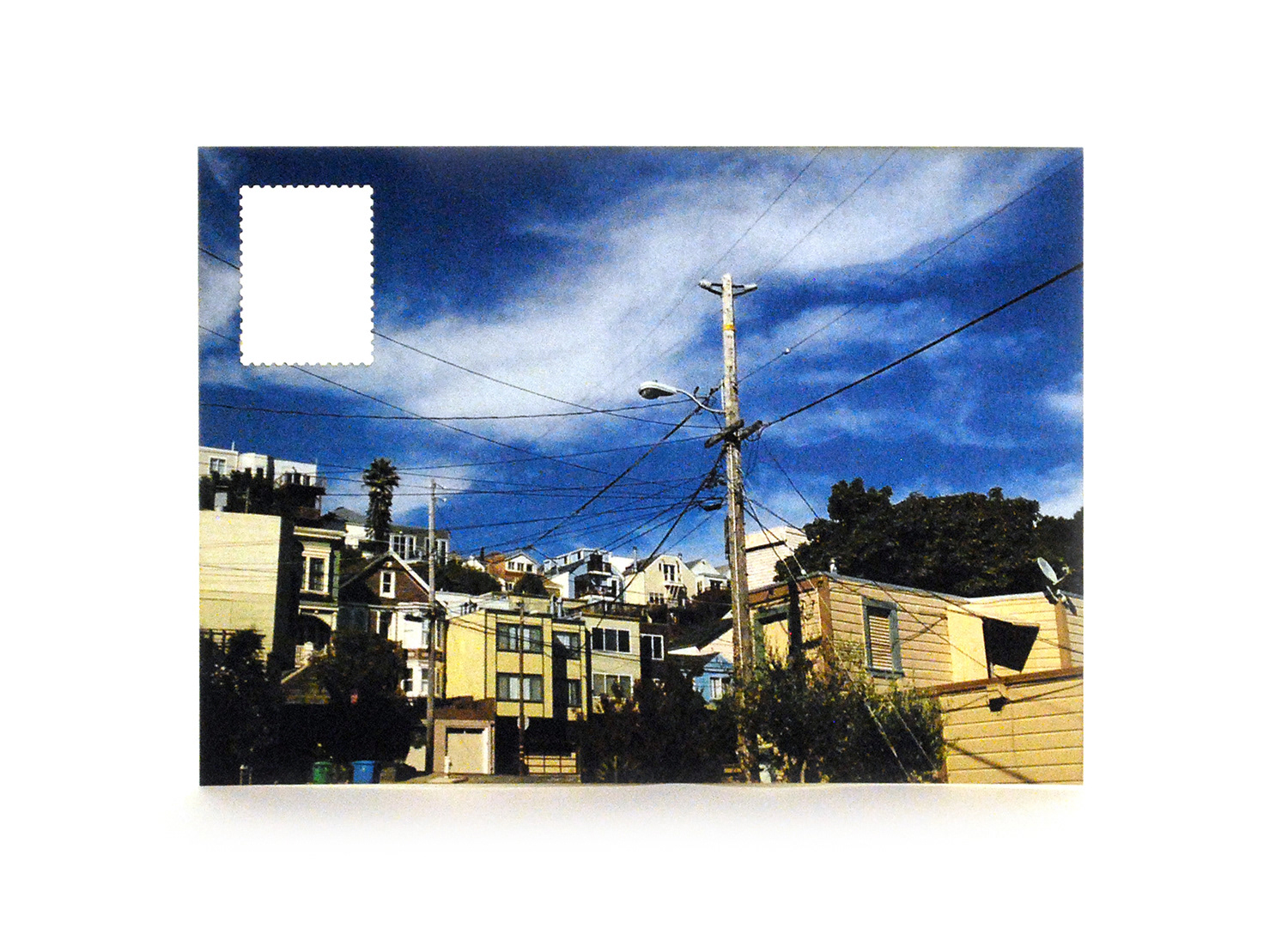 Sixteen postcards punched with a stamp shaped window. They are printed with pictures taken during my trip to the US.