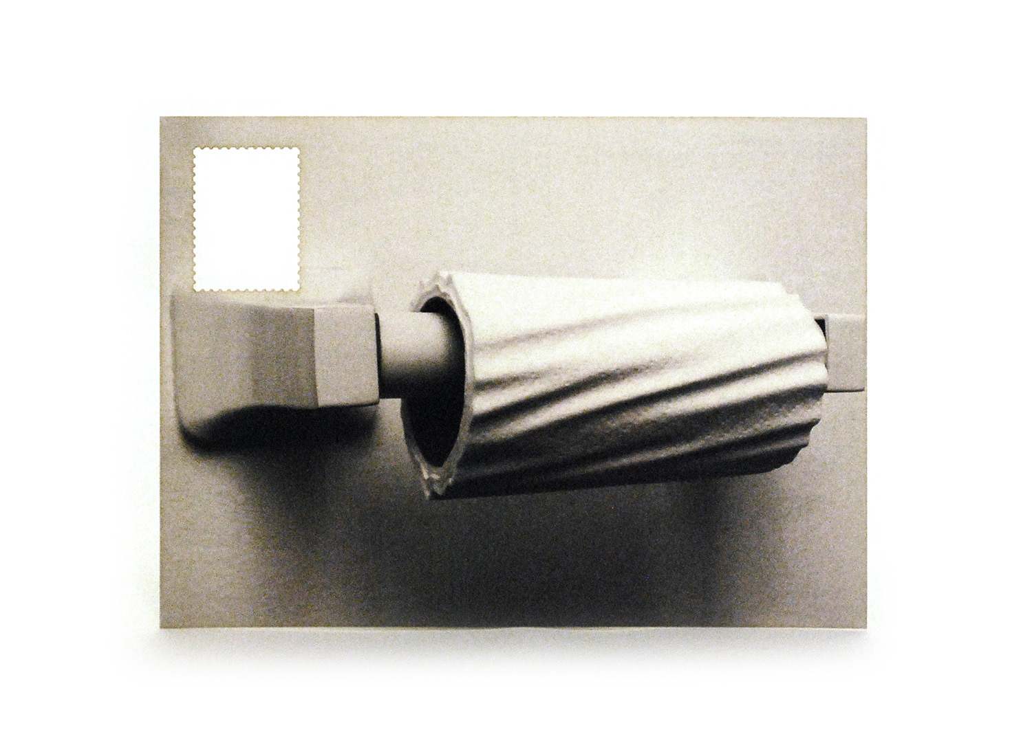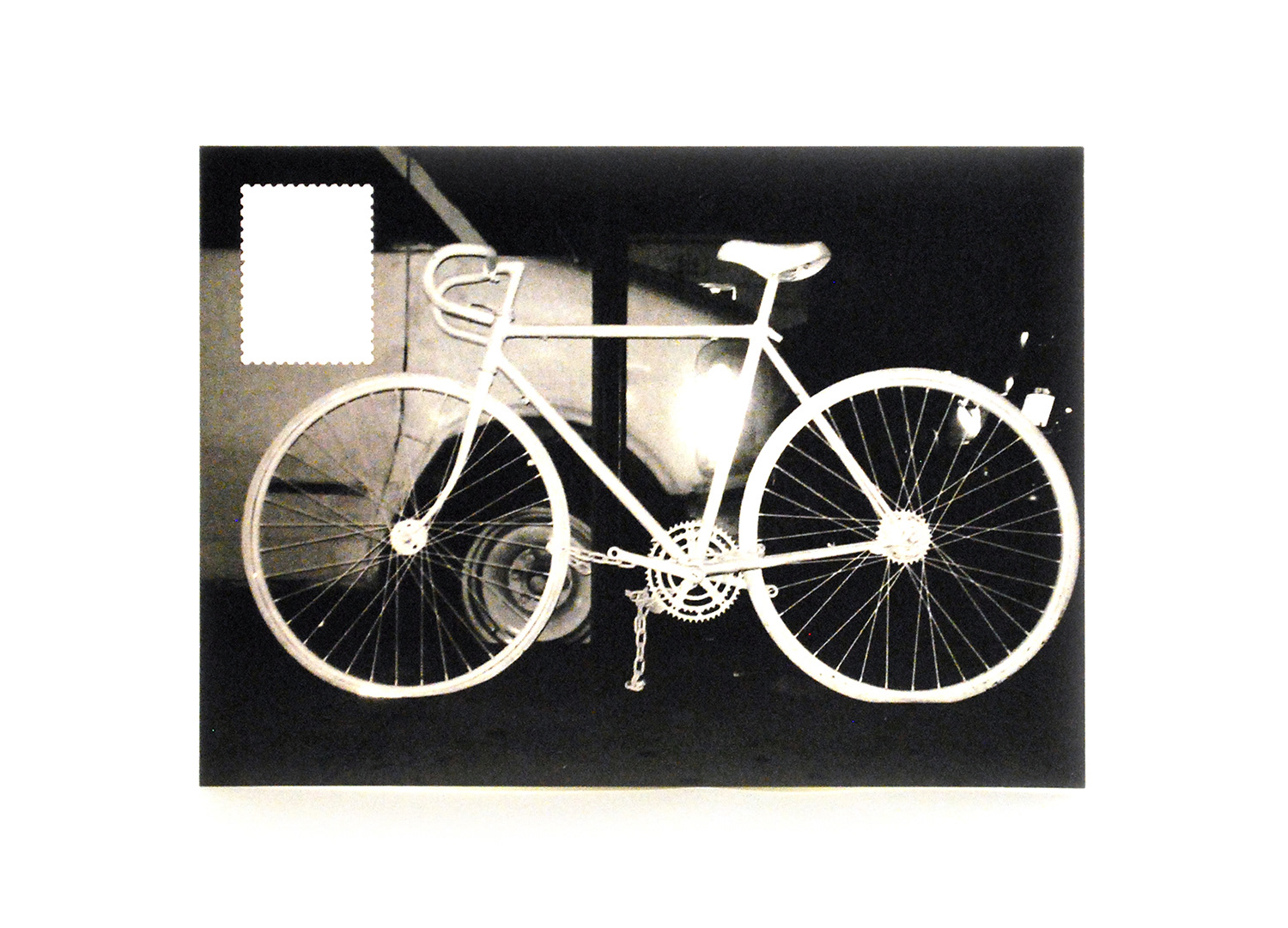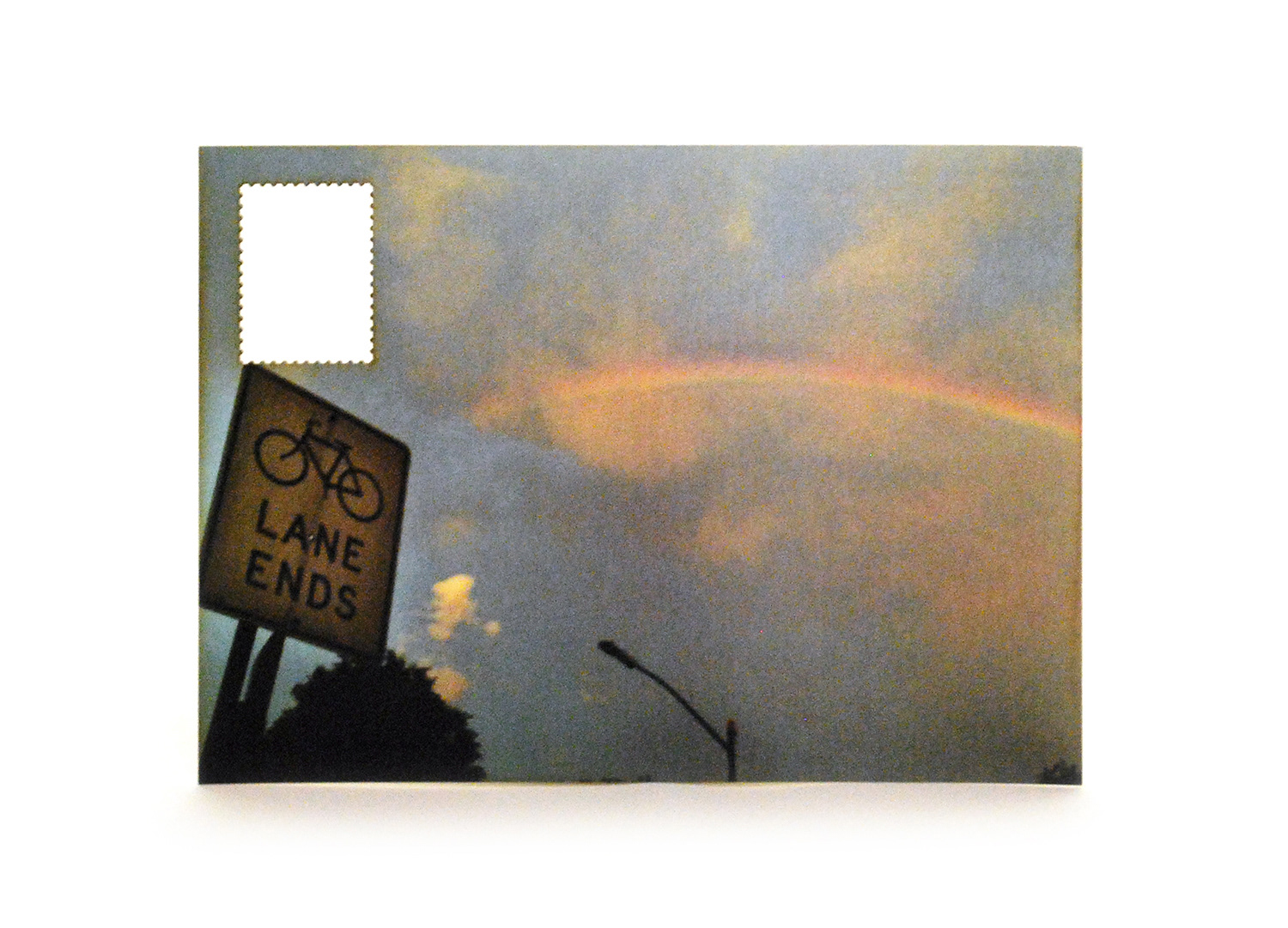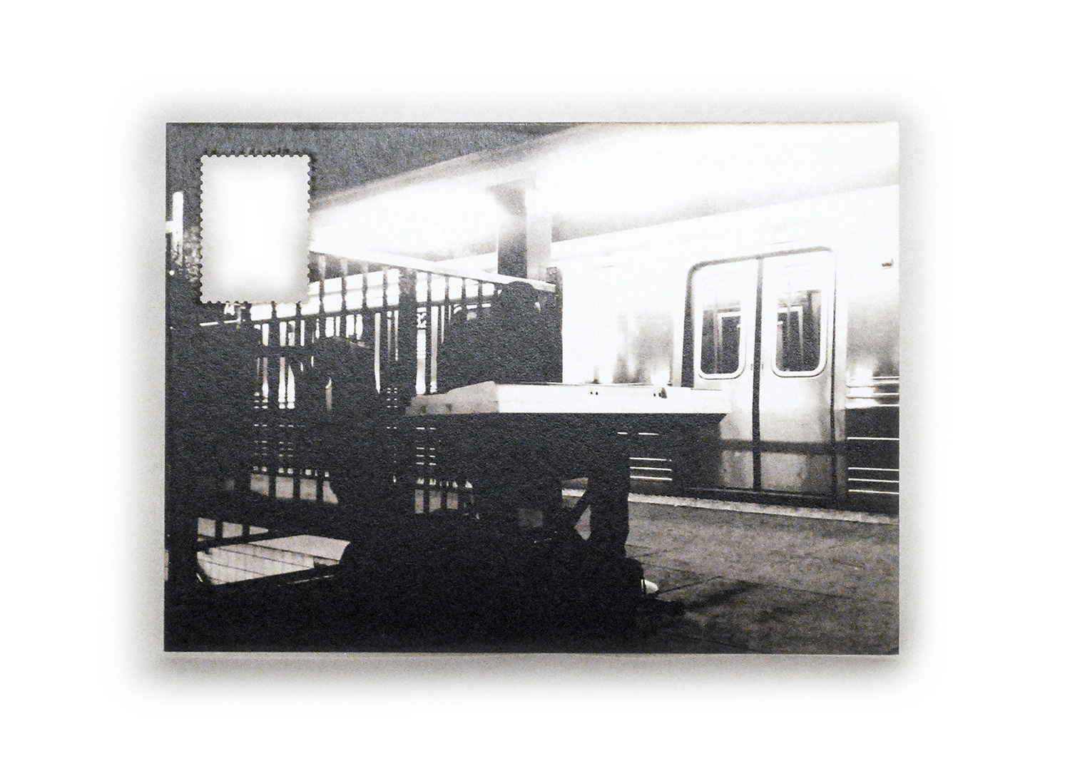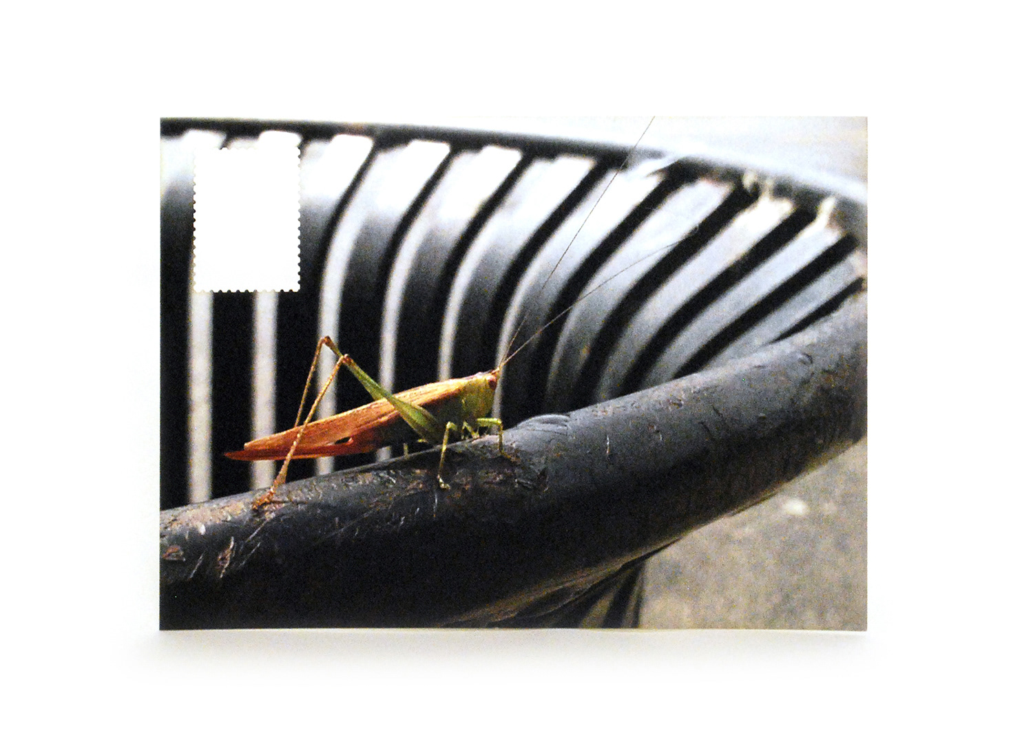 Sixteen postcards punched with a stamp shaped window. They are printed with pictures taken during my trip to the US.
